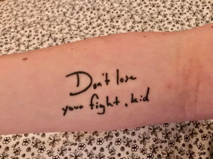 "У старшій школі я писав ці слова на руці маркером. У лютому я нарешті познайомився зі своїм улюбленим гуртом, і соліст написав мені слова пісні, щоб я міг зробити з них татуювання".
