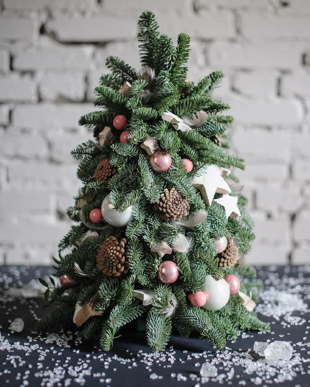 Ялинка з гілочок, прикрашена шишками та ялинковими іграшками/ Фото gsflowersstudio