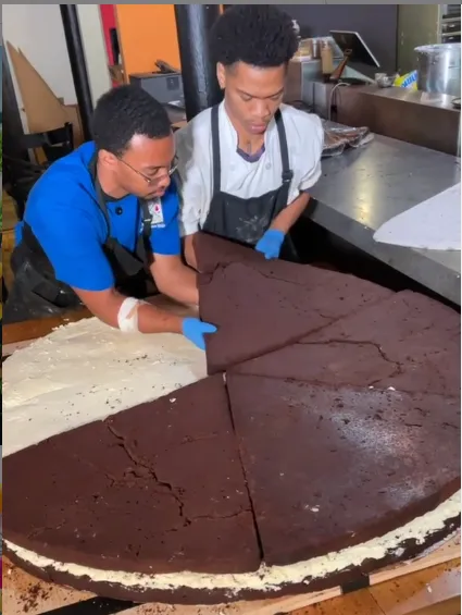Випікати таке велике Орео цілим було просто неможливо. Тому після того, як шоколадна маса була готова, бабуся, онук та кілька помічників випікали окремі трикутні шматки печива, а тоді складали всі частини у два круги, змащували посередині кремом, а зверху наносили візерунки.