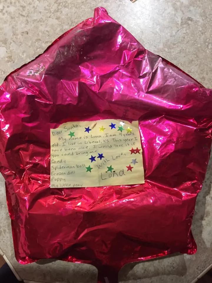 Коли він зняв кулю, то побачив маленький жовтий згорток – лист, у якому дівчинка просила у Санти цукерки, кульку у вигляді Людини-павука, ляльку з мультфільму "Крижане серце", цуценя та іграшку "Мій маленький поні". Це був різдвяний лист на ім'я Луни.