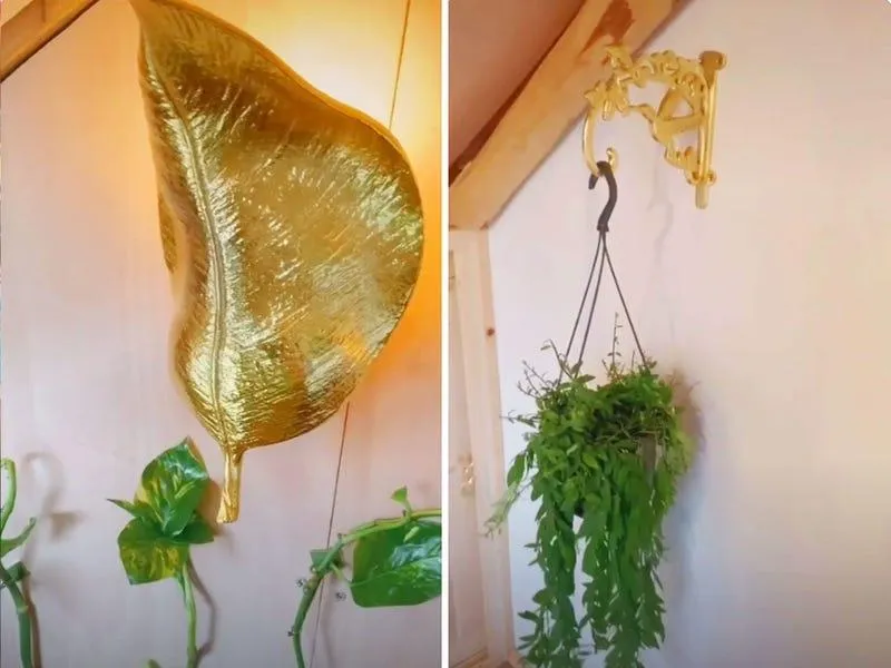 Наприкінці Шарлотта додала трохи декору, щоб приміщення виглядало більш домашнім та затишним: м'які пуфи й подушки, позолочені деталі, світильники у формі листя і, звісно, багато-багато зелені! Усі ці елементи були натхненні природою.