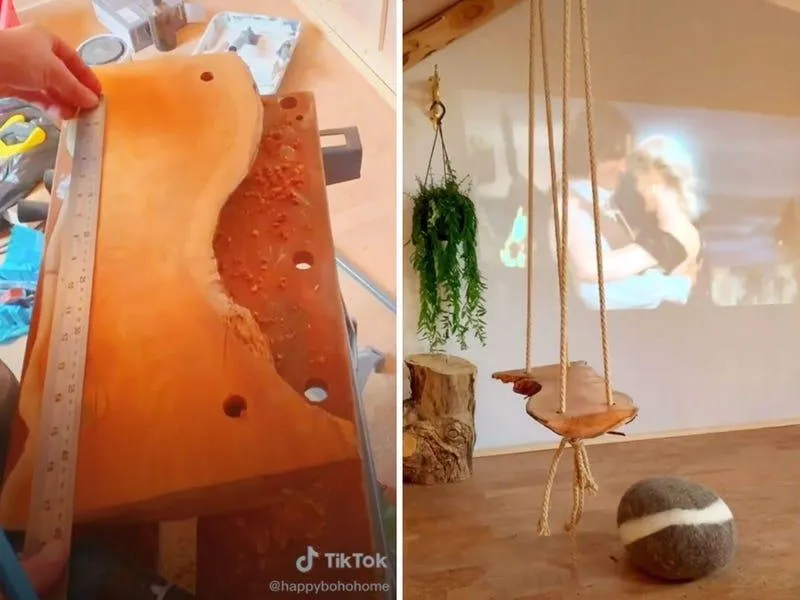 Додатковий оригінальний елемент житла на горищі – масивна дерев'яна гойдалка на грубих канатах, яку вони так само прикріпили на карабінах до стелі. Вона зроблена з великого шматка тисового дерева.