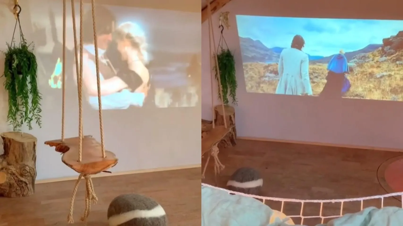 І ще одна мрія закоханої пари – проєктор, на якому можна дивитись фільми. Вони встановили його навпроти найбільшої стіни, і тепер Шарлотта і її наречений можуть проводити теплі вечори з улюбленими кінострічками. Кінцевий результат – ніби картинка у пінтересті, яку всі собі зберігають!
