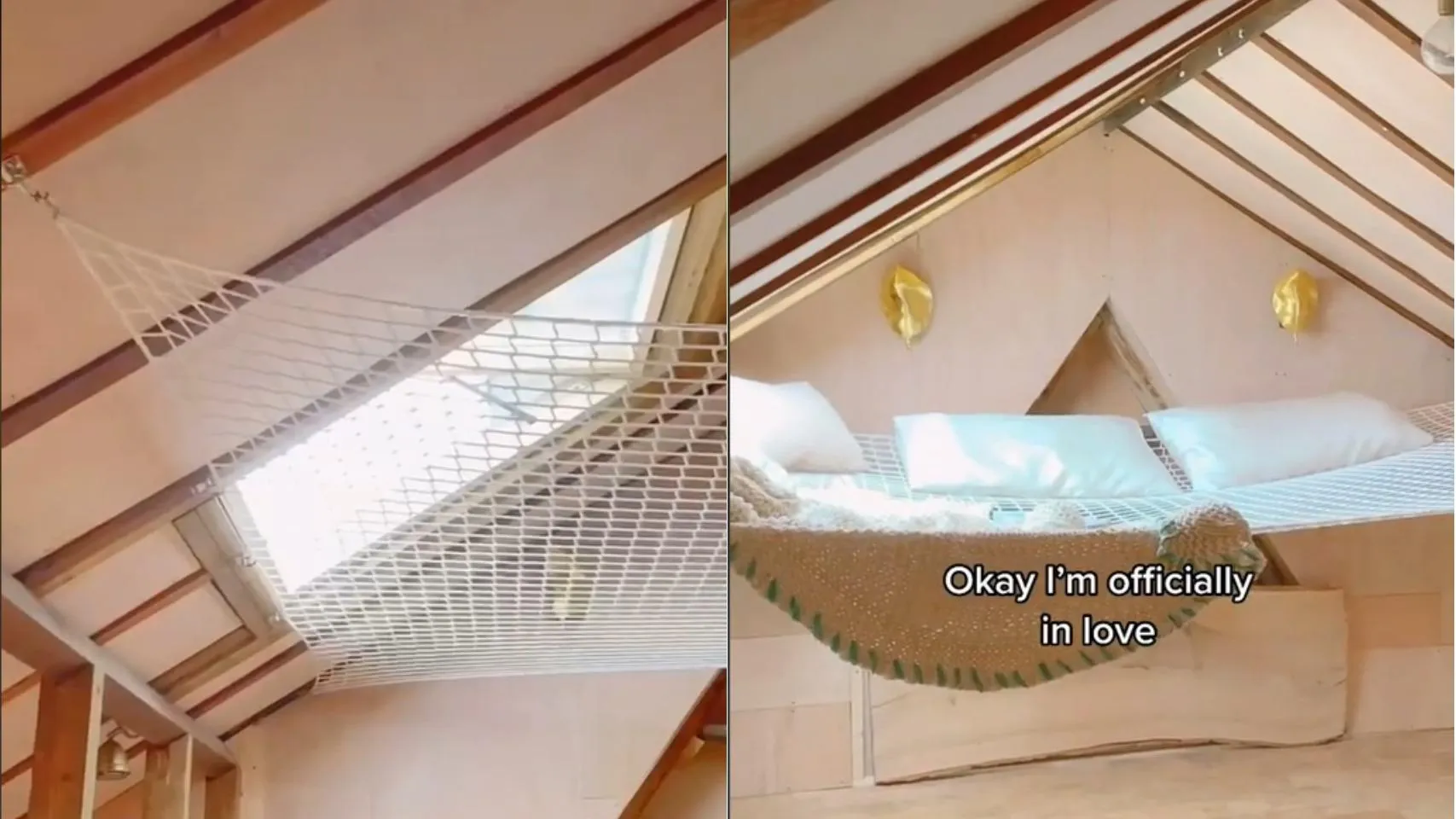 Щоб їх кімната була більше схожою на будиночок на дереві, Шарлотта та її наречений прикріпили під стелею біля вікна велику сітку, на кшталт гамака, на якій можна лежати й відпочивати. Таке саме імпровізоване "ліжко" вони зробили й для свого домашнього улюбленця, з яким не розлучаються.