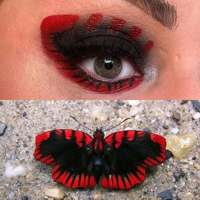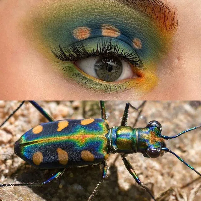 Дівчина вишукує фотографії різних екзотичних комах, жуків та навіть павуків і намагається передати їхні кольори у своєму макіяжі. Виглядає це дійсно нестандартно: її мейкап завжди ефектний та яскравий! Ось найцікавіші роботи талановитої візажистки. Закладаємося, ви ніколи не бачили настільки різнокольорових комашок, жуків та інших маленьких тваринок.