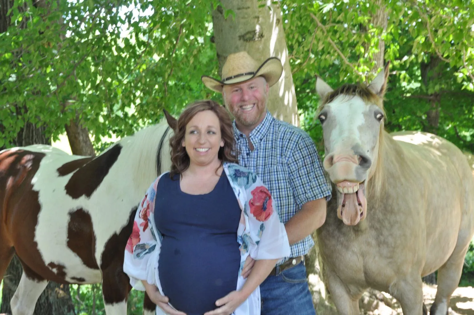 Як вияснилось, головним героєм на фото була не вагітна жінка з майбутнім батьком, а кінь, який корчив смішні гримаси та неабияк веселив власників і фотографа. Тваринку звуть Бакшот, і вона нахабно влізла у кадр до своїх господарів під час фотосесії. Його харизма полонила серця всіх присутніх і злитись на цього артистичного коника було складно.