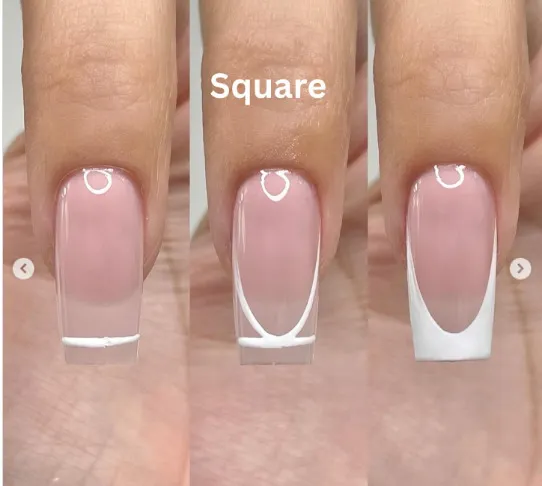 Квадратна форма нігтя — це найпростіший варіант, який вважається класикою. Ця форма повністю відповідає прямому перпендикулярному росту нігтя. З цією формою нігтьова пластина зберігає прямі кут, а френч на ній видається максимально насиченим.