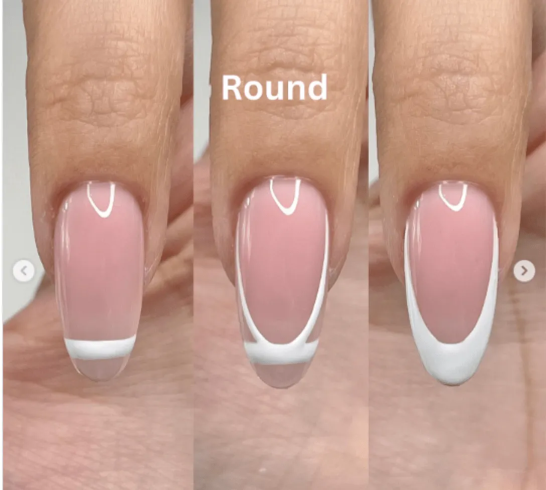 Кругла форма. Такий варіант нагадує форму кола й ідеально підходить для коротких нігтів. Ця форма разом з френчем створює натуральний вигляд, підкреслюючи природну красу нігтів без зайвих деталей.