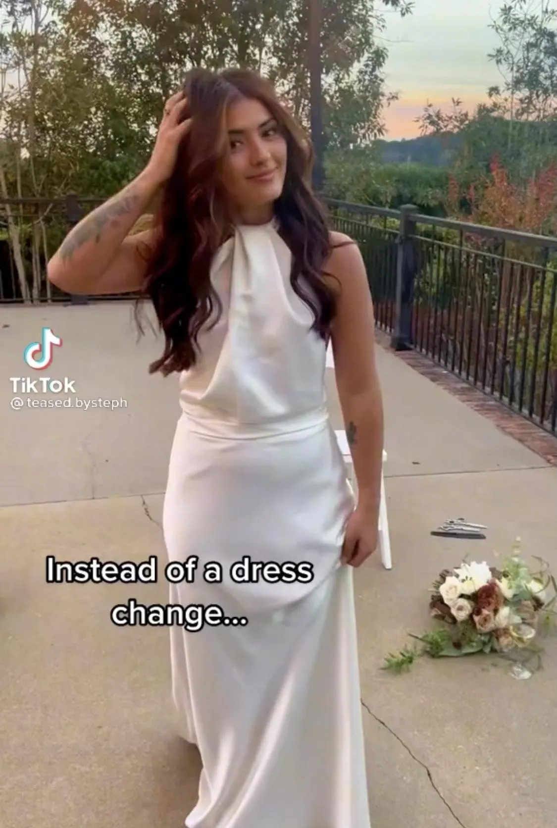 Дівчина змінила вбрання та одягла приголомшливу шовкову білу сукню до підлоги, а тоді перейшла до зачіски. Вона скористалась спеціальною накидкою, аби не зіпсувати сукню, і підстригла локони. Гості були в захваті від кардинальних змін.