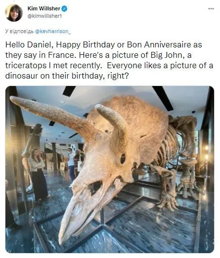 Привіт, Даніелю, з днем народження чи bon anniversaire, як кажуть в Франції. Це фото Великого Джона – трицератопса, з яким я нещодавно познайомилася. Всі хлопчики хочуть подивитися на динозавра у свій день народження, правильно?
