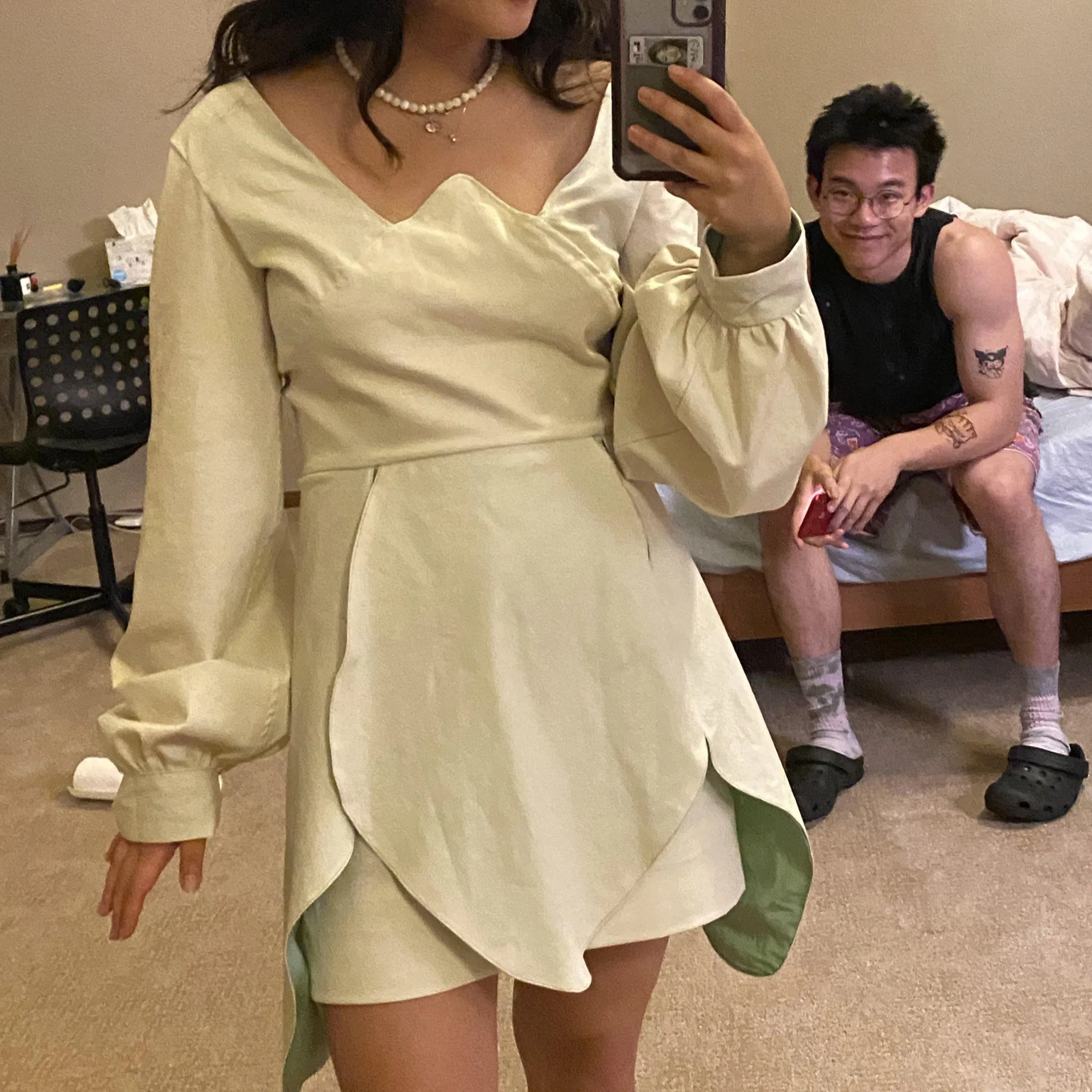 Нарешті, дівчина приміряла готовий випускний наряд. Витончена молочна мінісукня виглядає справді чарівно: спідниця, зшита з різних шарів "пелюсток", та красивий фігурний виріз нагадують сукню феї Дінь-Дінь з мультфільмів про Пітера Пена, а елегантності додають об'ємні рукави-ліхтарики. На задньому плані хлопець гордо посміхається, цілком задоволений своєю роботою.