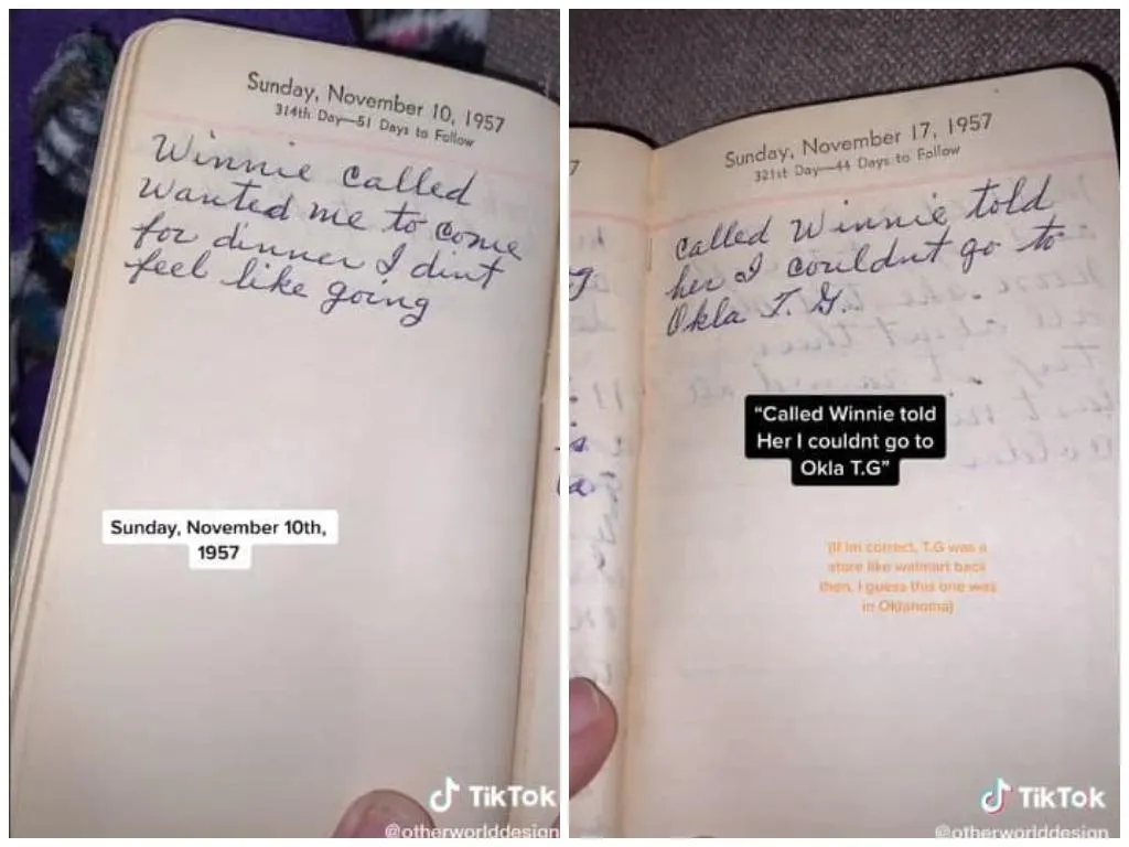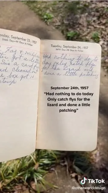 Користувач з ніком otherworlddesign лише нещодавно створив акаунт у тіктоку для того, щоб показати свою нещодавню знахідку, справжню капсулу часу – старий щоденник з 50-х. У ньому домогосподарка день за днем не тільки складала списки покупок, а й ділилась своїми думками. Ці записи доводять: з плином часу у людей залишаються одній й ті ж проблеми.