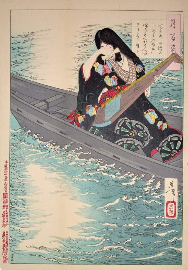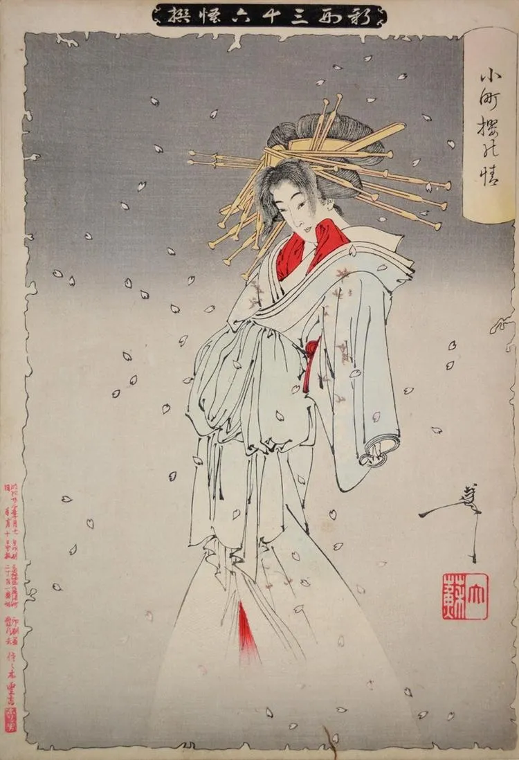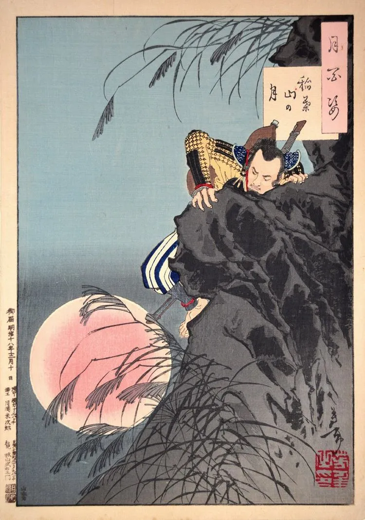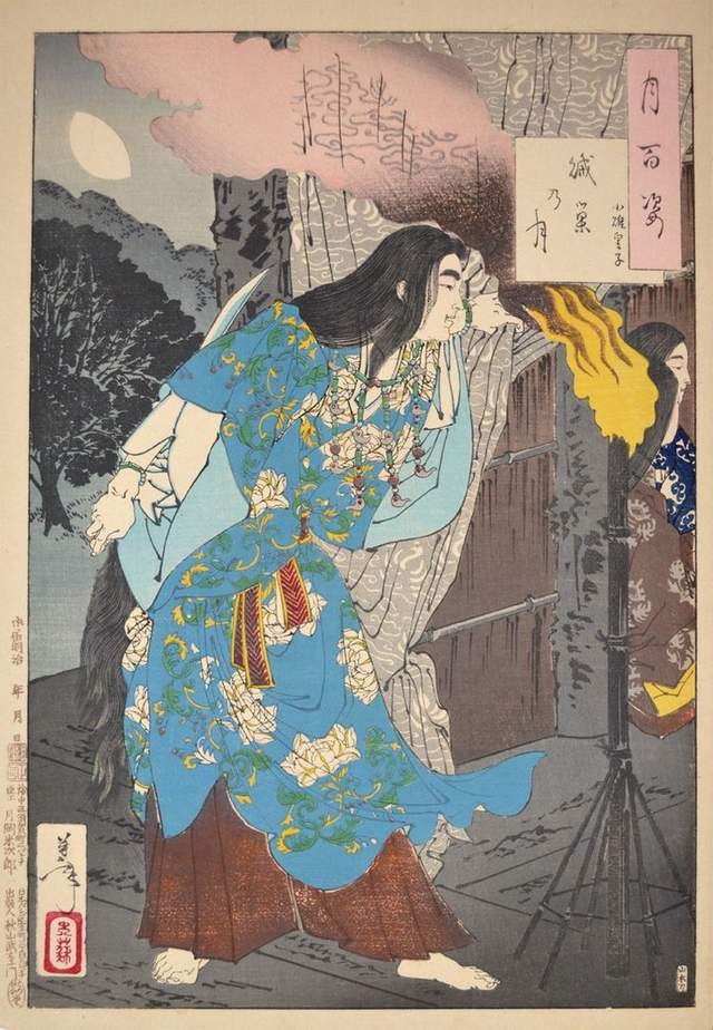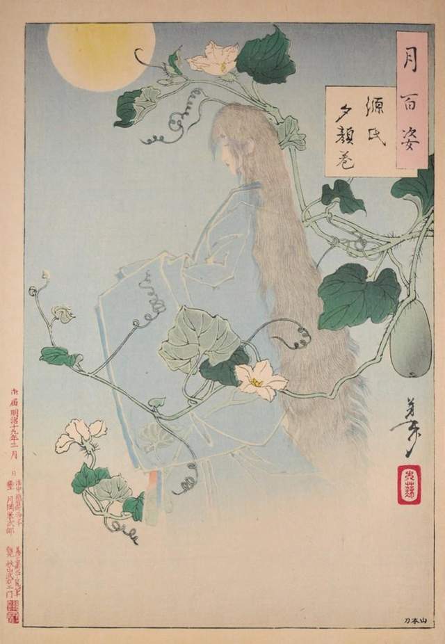 Цукіока Йосітосі у свій пізній період створював портрети, які мали риси самотності, покірливої долі та задумливості. У 1885 році Йосітосі почав видавати серію гравюр "100 видів місяця".