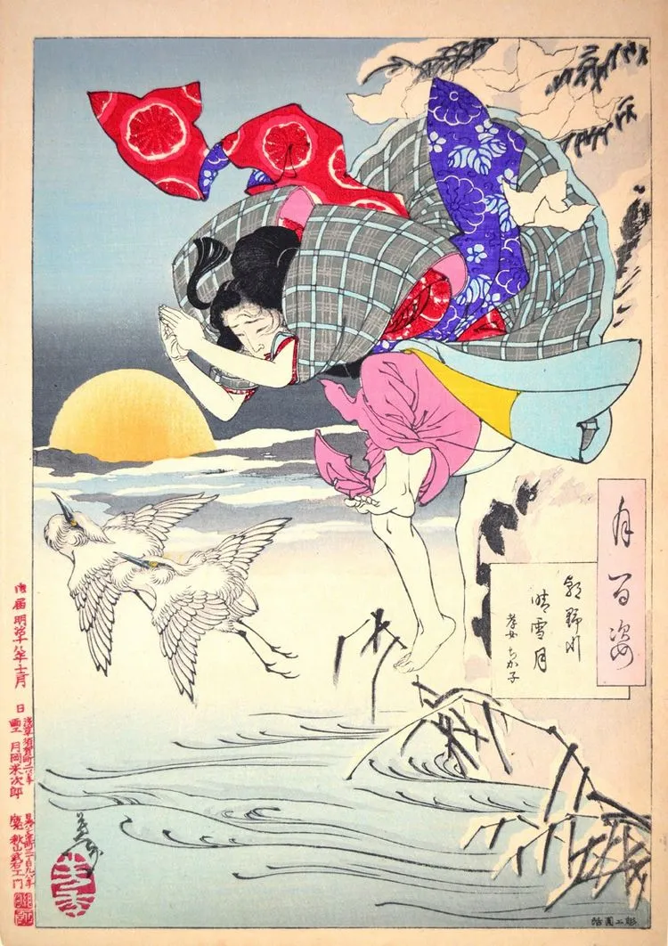 Техніка укійо-е була активно розповсюджена на території Японії у XVII столітті. Саме слово "укійо", дослівно перекладається як "пливе світ". Найвидатніші роботи відомого японського майстра Цукіока Йосітосі зібрало видання Сameralabs.