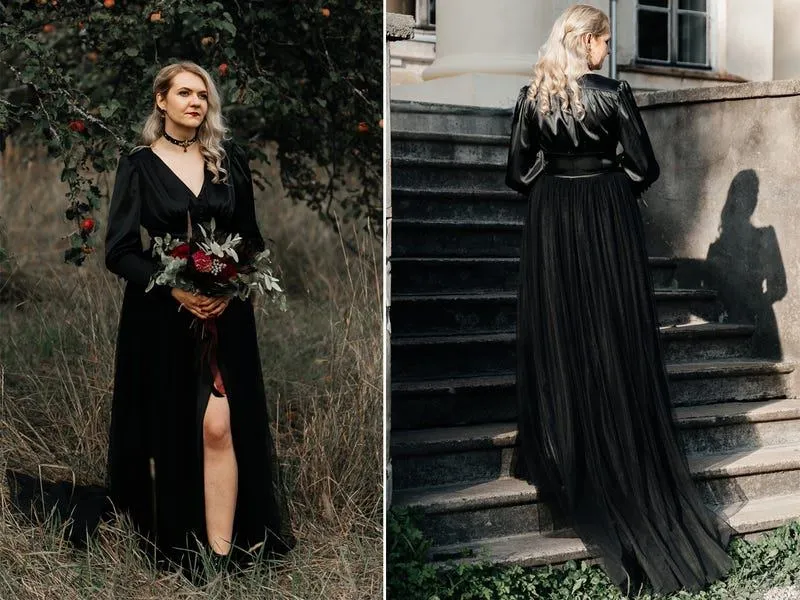 Все більше молодих пар відходять від традиційних уявлень про весілля: роблять цілі тематичні святкування або відмовляються й від окремих, звичних нам елементів, як-от білої сукні. З блискітками, воланами, мереживом і напівпрозорою тканиною – весільні сукні у королівському чорному кольорі нічим не поступаються білим!