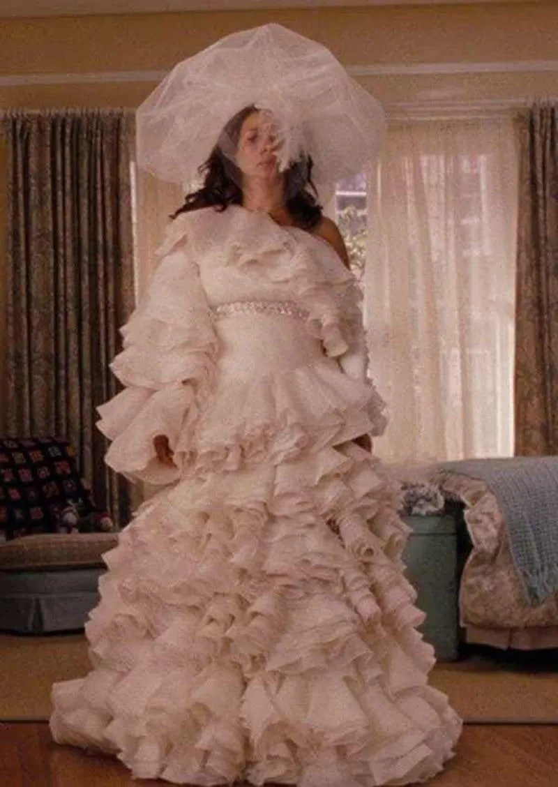 Перебільшили з образом нареченої і костюмери фільму "Моє велике грецьке весілля". Вони одягли Тулу Портокалос в об'ємну сукню з лелітками, посередині оздоблену великими трояндами, мереживом, дорогоцінними прикрасами, масивним кольє та високою фатою.