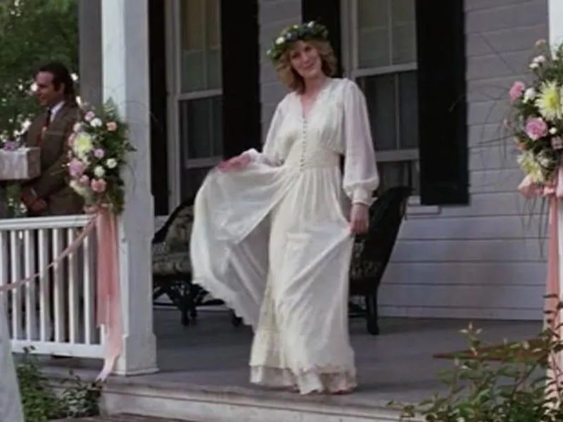 Стрічка "Форрест Гамп" також відзначилась не найстильнішою сукнею Дженні. Довгоочікуване весілля головних героїв насправді трохи розчарувало образами. Наречена одягла вбрання в провінційному стилі з довгими рукавами та ґудзиками, а доповнила все квітковою короною.
