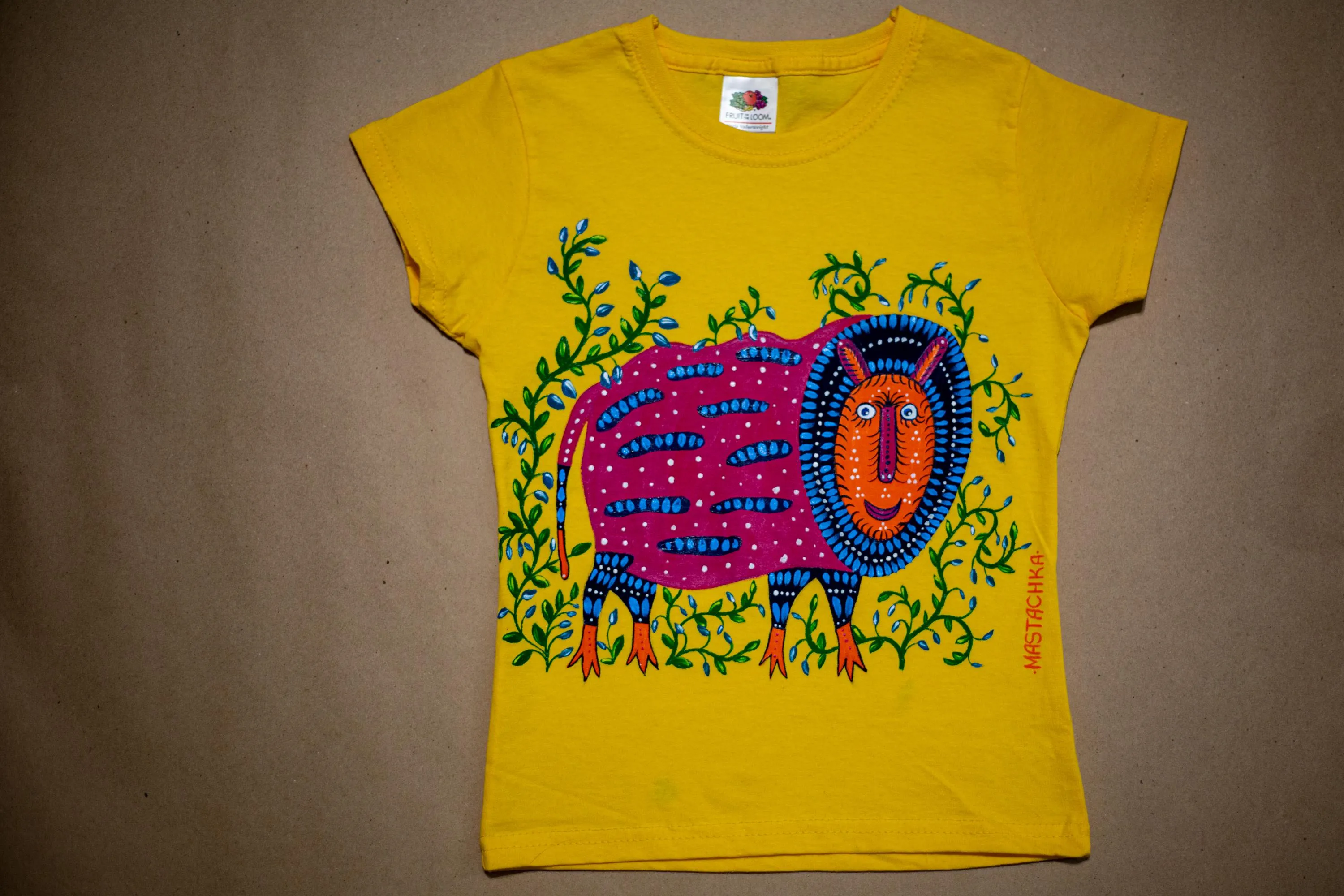 Звірі Марії Примаченко "ожили" і на футболках Оксани Наумчук. Жінка вміло розфарбовує одяг яскравими зображеннями за мотивами картин знаменитої українки та перетворює однотонні тканини у фон для казкових звірів.