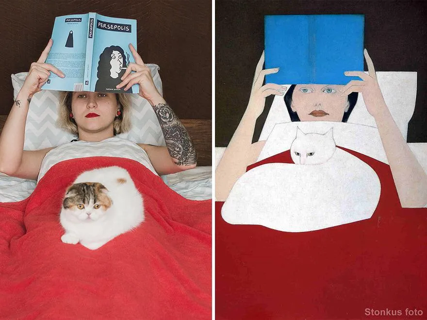 Його вірними помічниками стали кохана дівчина і домашні улюбленці, а реквізитом – лише ті речі, які вони змогли знайти у себе вдома. Так вони створили більше десятка кумедних та прекрасних фото, які змушують по-новому подивитись на класичне мистецтво.