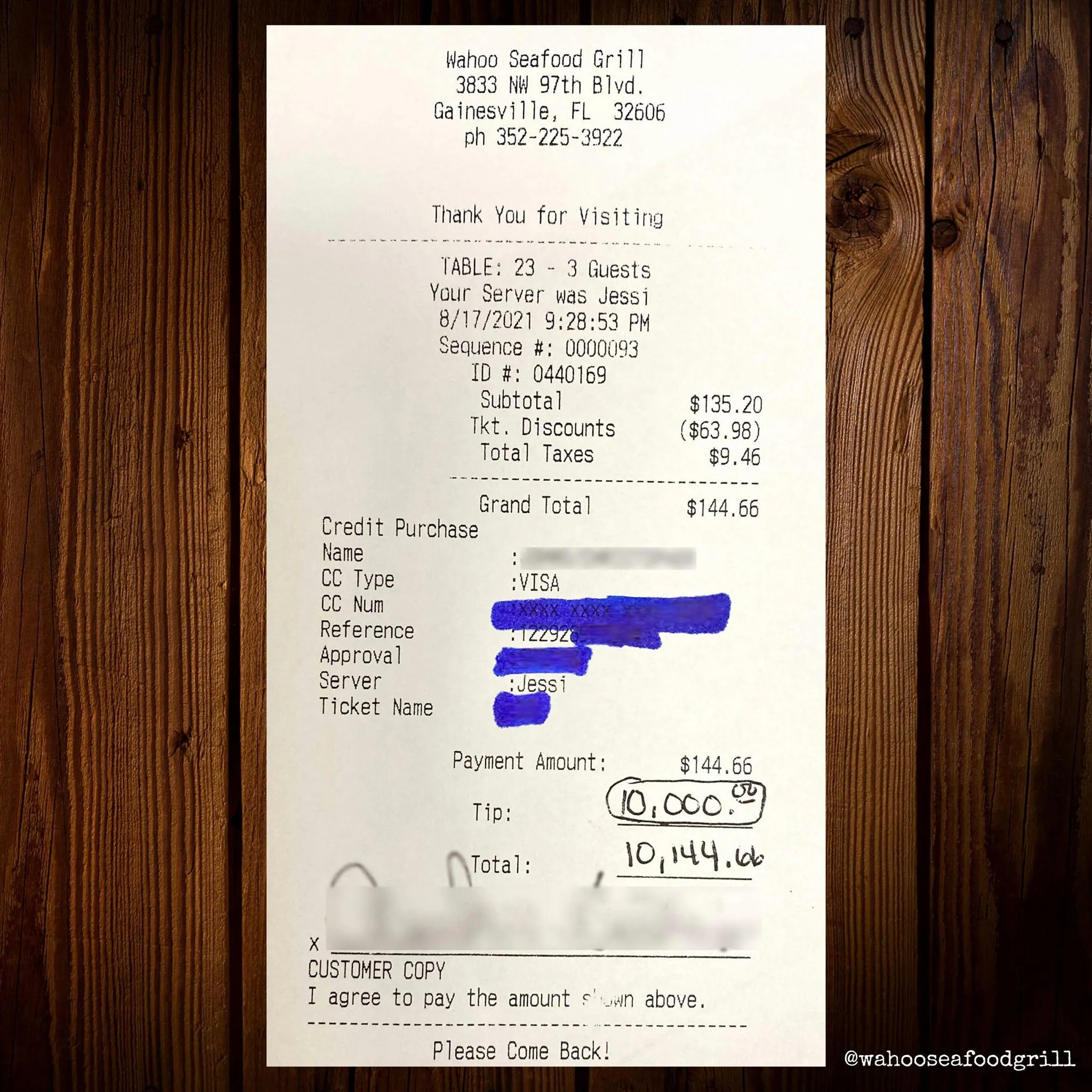 Чек клієнта / Фото фейсбук Wahoo Seafood Grill Gainesville
