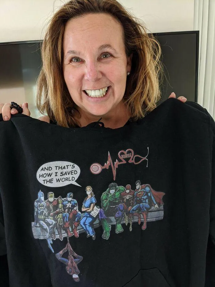 Ця жінка з березня працює медсестрою у відділенні з хворими на Covid-19. "Я ніколи не бачив її такою щасливою як у день, коли вони отримала цю футболку", – каже її син