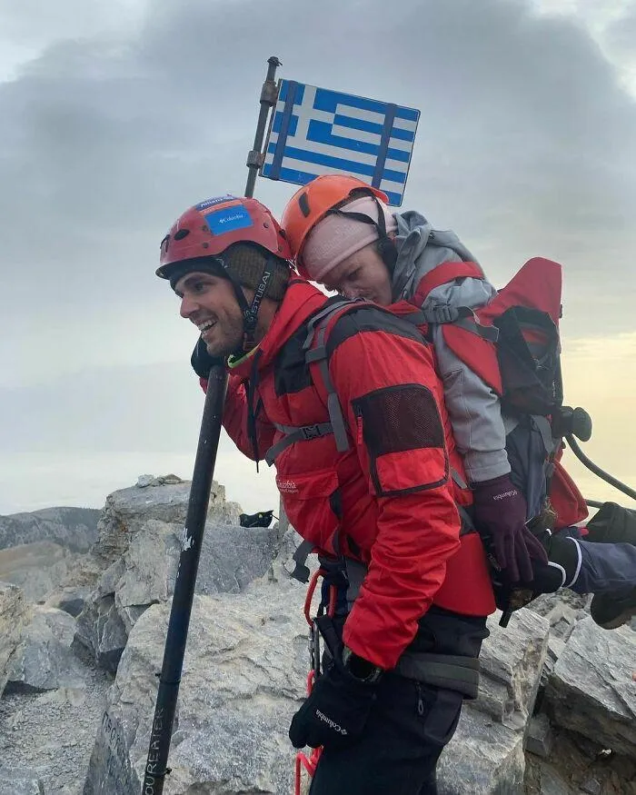 Цей спортсмен, Маріос Джанкану, здійснив мрію студентки-біологині з інвалідністю на ім'я Елефтерія та виніс її на вершину гори Олімп