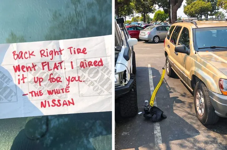 "Задняя правая шина спустилась. Подкачал ее для вас. Белый Nissan"