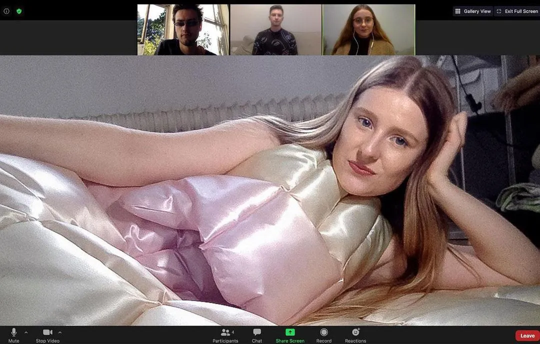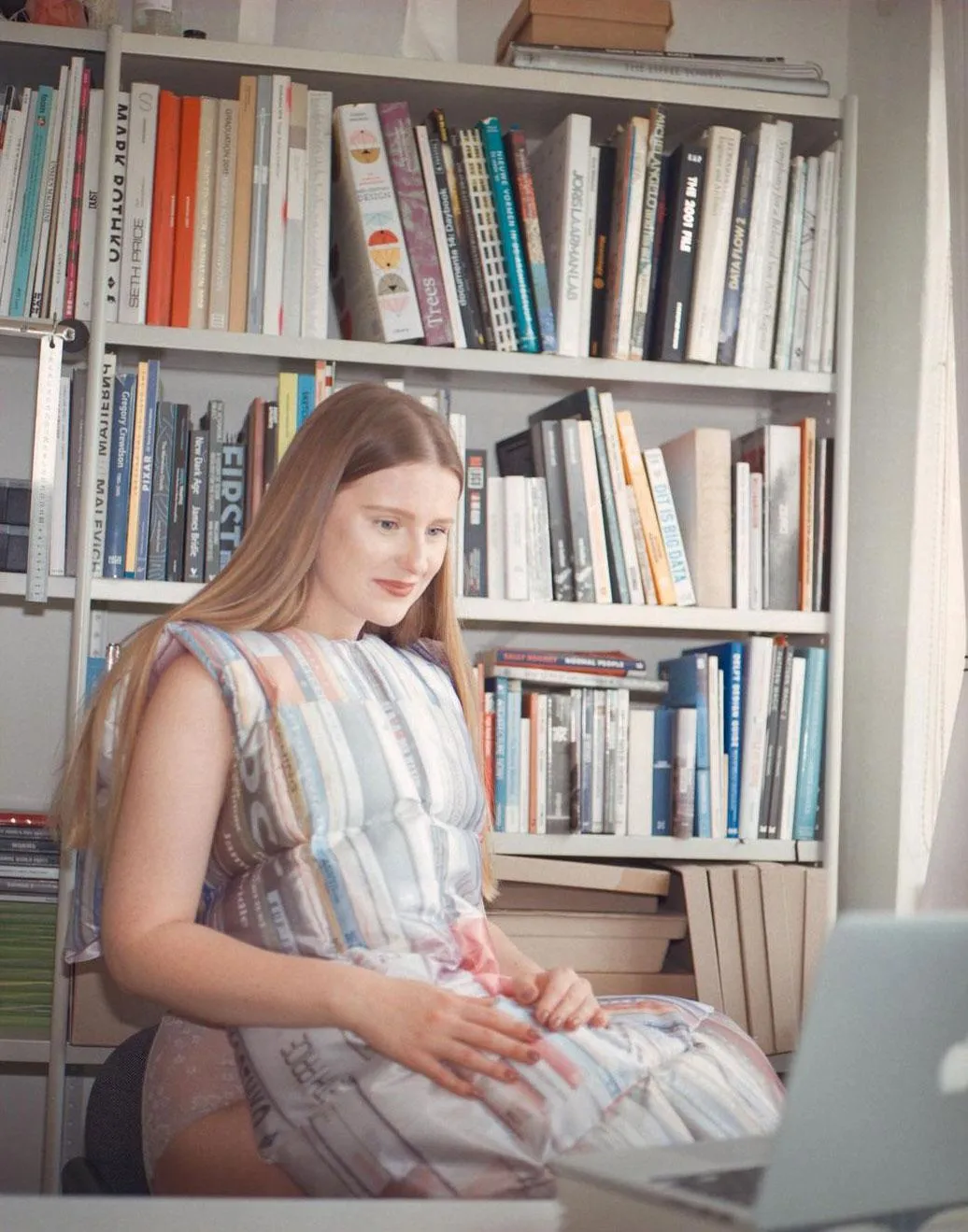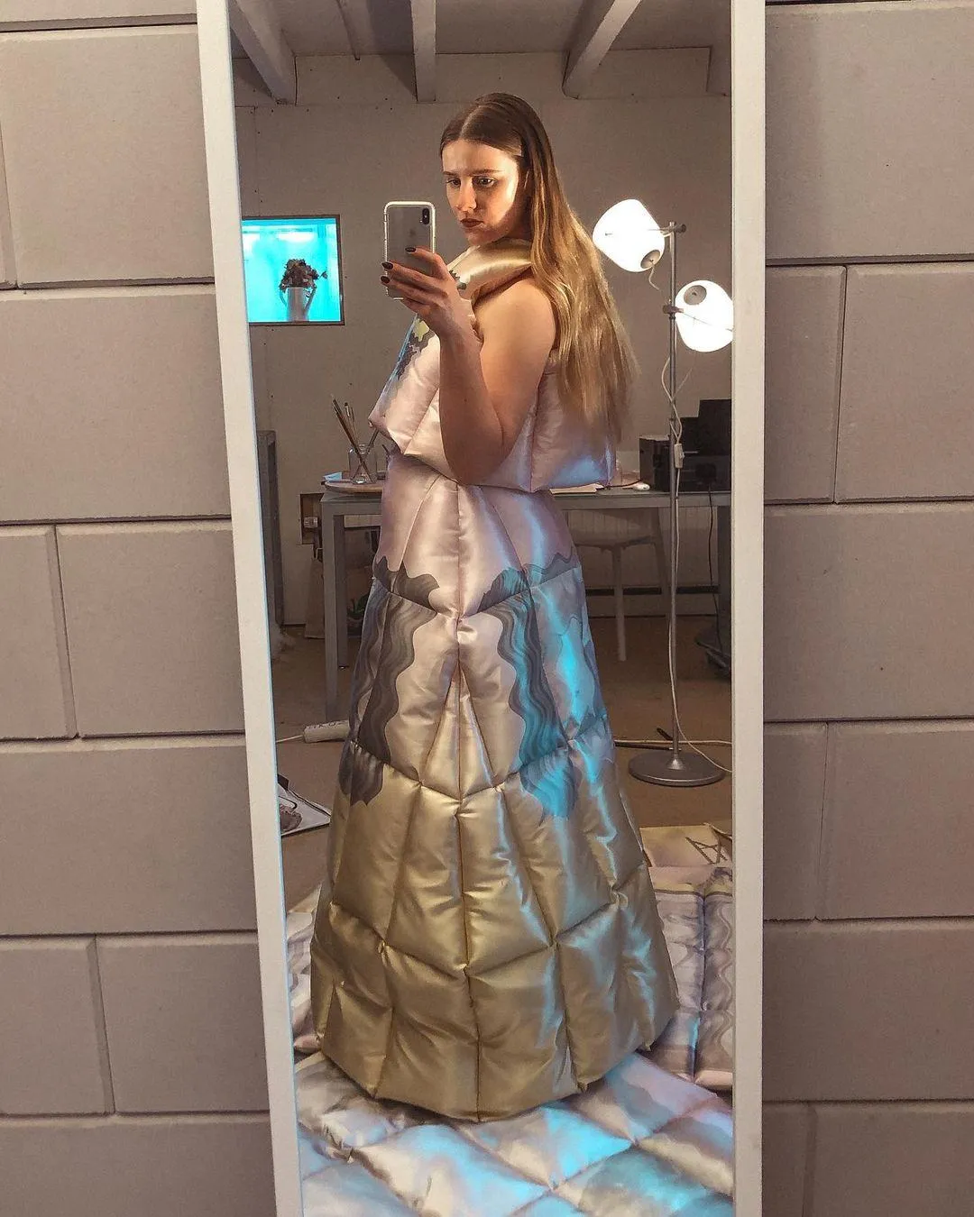 "Пандемия и самоизоляция очень сильно повлияли на мой дипломный проект. Постоянные разговоры через Zoom стали привычным делом. Это сбивало меня с толку: получается, что я находилась в определенном промежуточном пространстве – не совсем дома. Мне было интересно увидеть, как я выгляжу на экране при разговоре с другими. Желание инсценировать пространство вокруг себя стало отправной точкой этой коллекции. Хотя я понимаю, что это скорее модная поэзия или модный дневник, чем настоящая мода ", - говорит дизайнер.