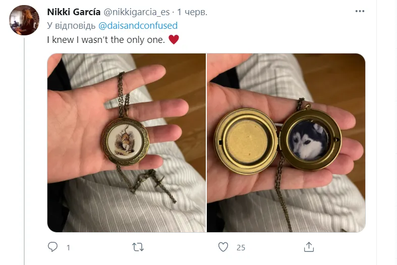 Внутри красивого голубого медальона с белыми цветами были черно-белые фото домашних любимцев женщины. На одном фото – пушистый котик, а на другом – золотистый ретривер. Это неожиданное открытие так растрогало Дейзи, что она просто не могла не поделиться этим в соцсети.