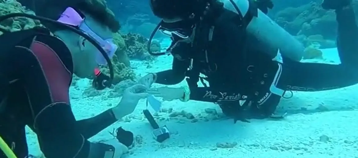 Все началось на глубине в 10 метров, когда пара достигла дна. Маттиа достал несколько ламинированных листов, на последнем из которых было важнейший вопрос – "хочет ли Фиона навсегда стать его другом по дайвингу?". После этого парень подал любимой колечко.
