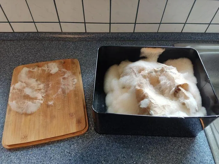 "Нет, это не сахарная вата. Жена забыла хлеб в хлебнице на три недели"