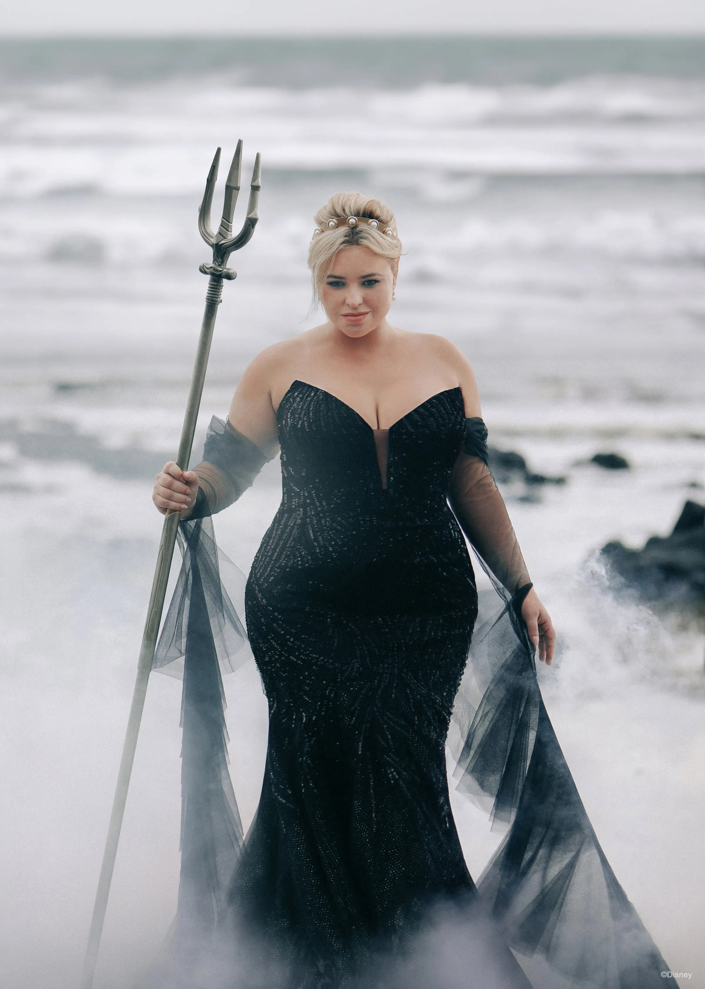 Платье морской ведьмы Урсулы действительно напоминает силуэт мультипликационной злодейки. Дизайнер украсила эффектное платье вышивкой с бисером и эффектными рукавами, которые можно снять.