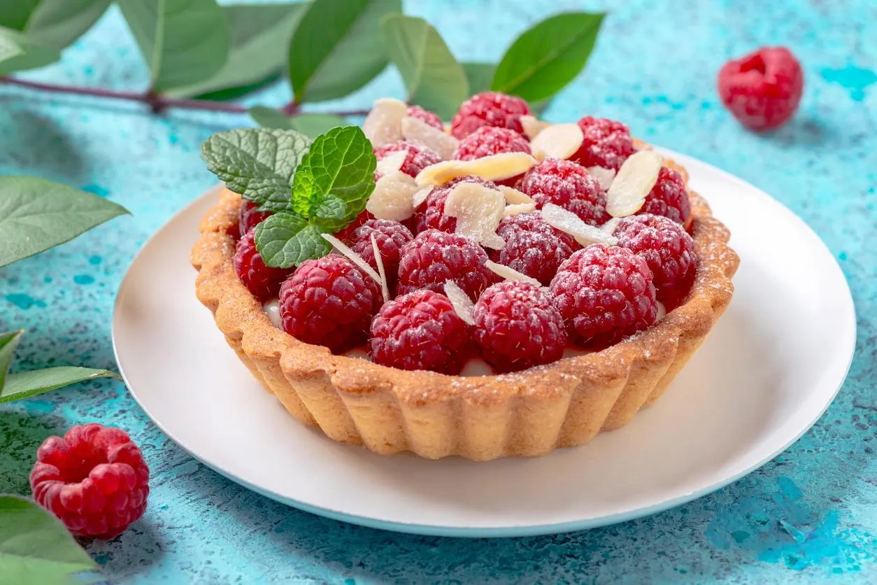 К розовому полусухому игристому прекрасно подойдет малина со сливками и миндальными хлопьями / Фото iStock