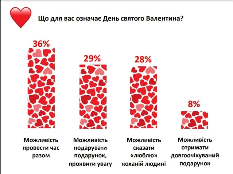 Понад третина українців перш за все планують провести це свято разом зі своїми коханими. Трохи менше опитаних у цей день хочуть проявити увагу до своєї другої половинки, зробивши приємний подарунок, та поділитись своїми почуттями чи навіть зізнатись у коханні. І лише 8% українців розглядають День Валентин як можливість отримати від партнера подарунок, на який вони довго очікували.