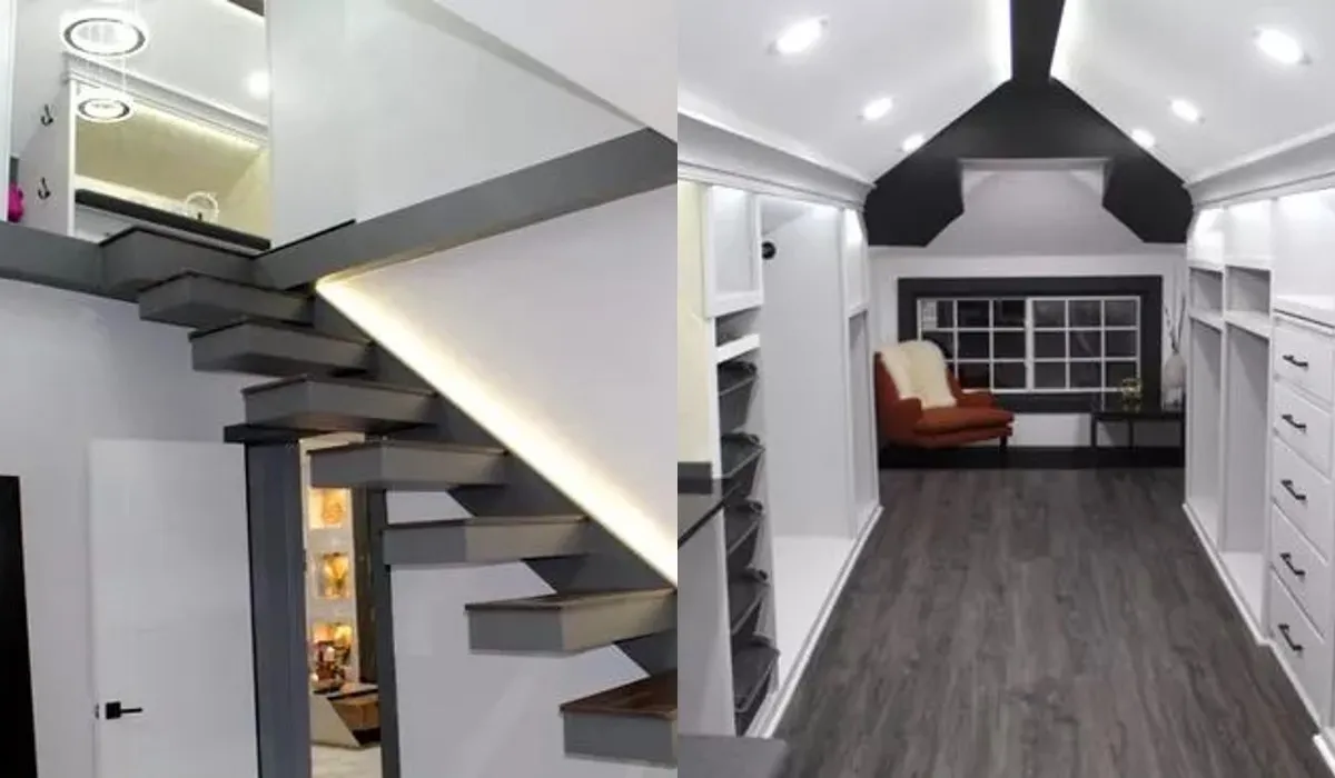 Американець встановив дерев'яний каркас для стін, а потім обшив їх гіпсокартоном і зробив зручні полиці з дерева. Для підлоги чоловік використовував ламінат, а для надання сучасного вигляду все було пофарбоване в різні відтінки сірого.