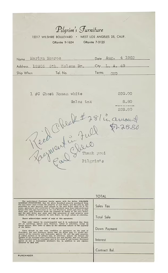 І на цьому лоти з особистими речами Мерилін Монро не скінчилися. Також продали лавандове атласне трико – 29 250 доларів, стару чекову книжку з іменем Монро – 10 400 доларів, вечірню чорну сукню з фільму "Сверблячка сьомого року" – 127 000 доларів. Також були й моторошні лоти – квитанція Pilgrim's Furniture, яка датована днем смерті Мерилін Монро, та латунна табличка, яка колись була встановлена у склепі над могилою Мерилін Монро. Ці лоти продали за 12 500 і 88 900 доларів відповідно.