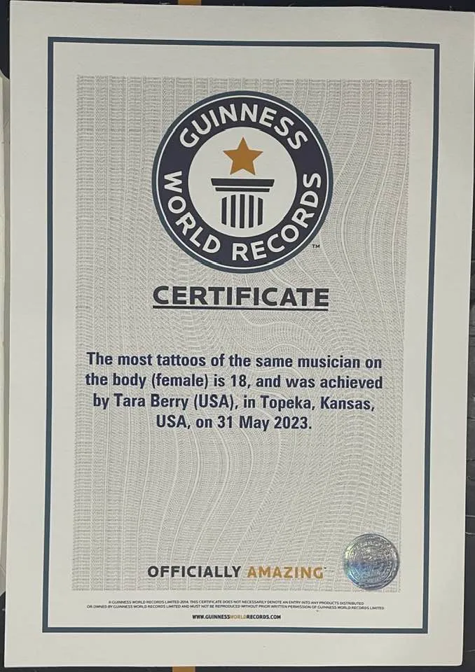 Сертифікат Книги рекордів Гіннеса за найбільшу кількість тату з Мадонною / Фото Тари Беррі