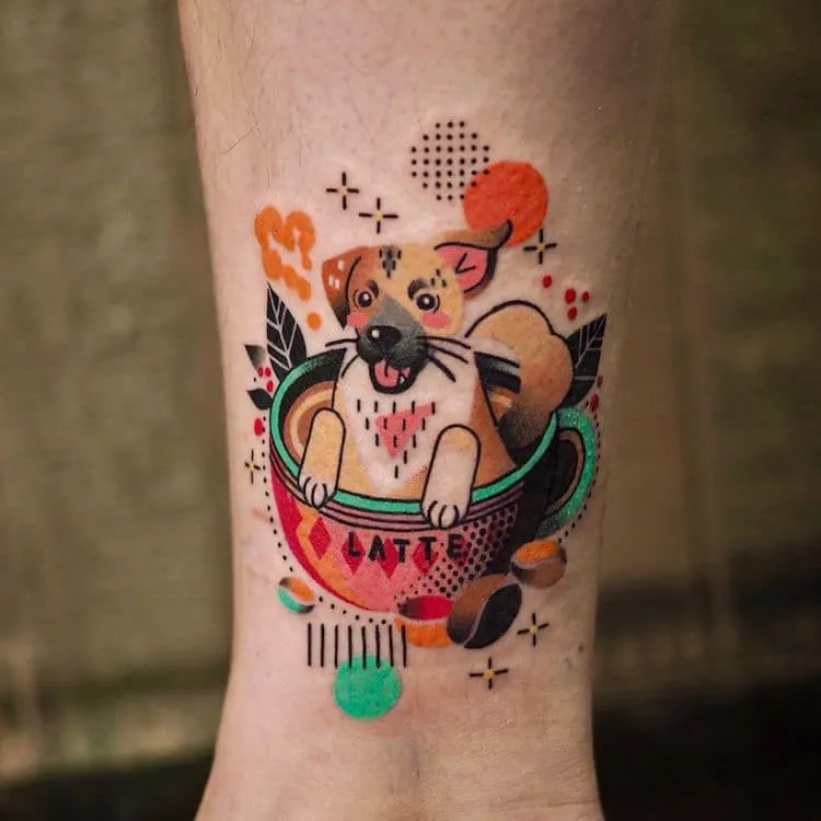 Інше татуювання зображує щасливого собаку, що сидить у великому горнятку кави.