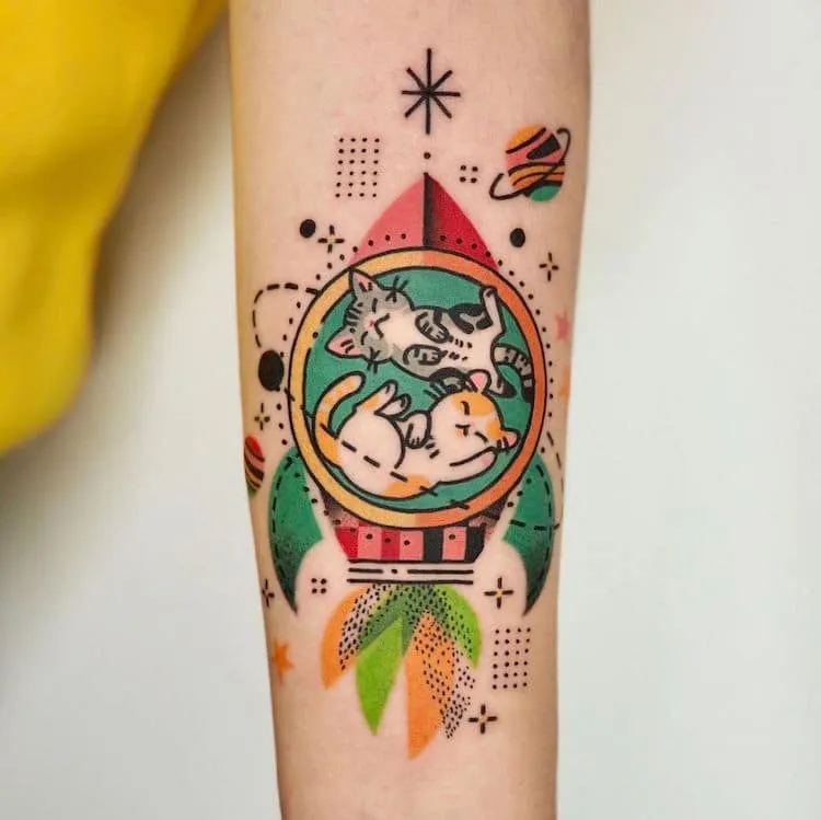 У більшості татуювань Ген зображає тварину та кілька простих прикрас, однак є і більш складні та часом навіть магічні фони. Ось тут два котики туляться всередині ракети, яка прямує до космічного простору.