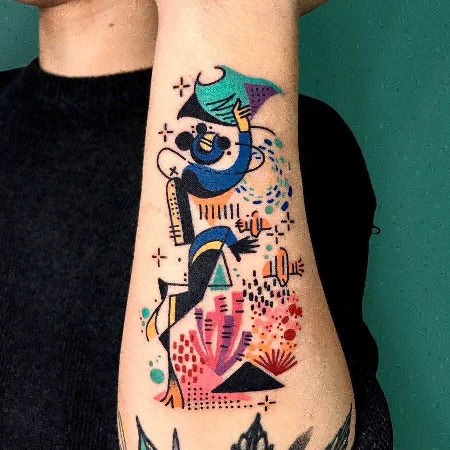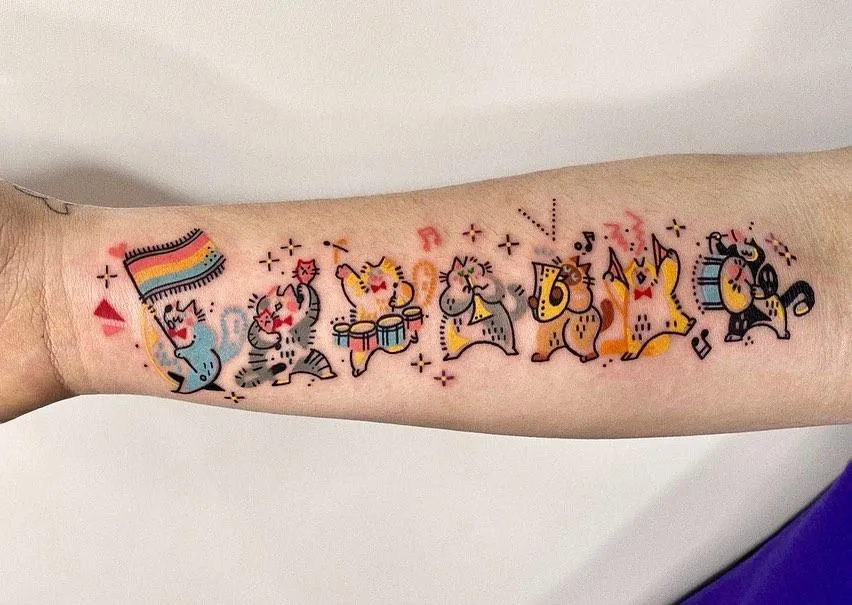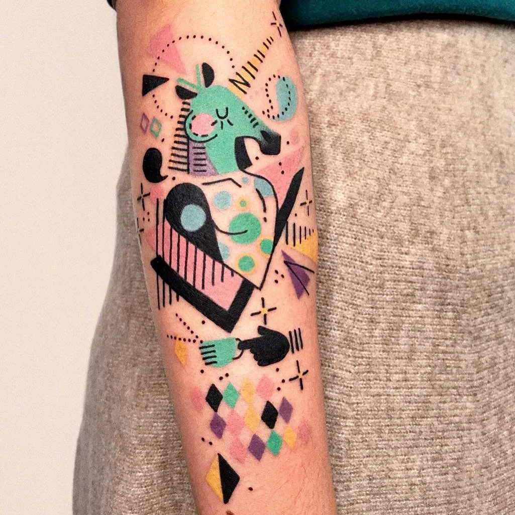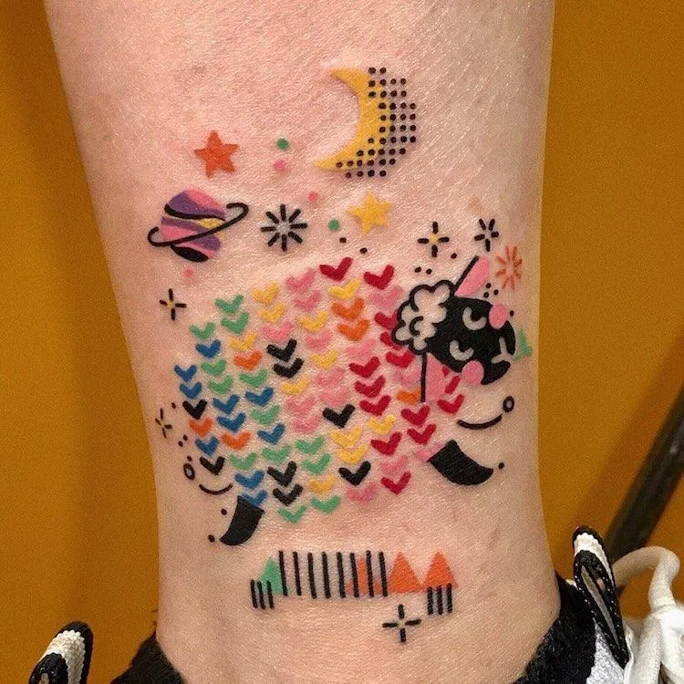 Від веселкових овець та леопардів до їжаків та кошенят із веселими обличчями – кожен із цих яскравих звірів виглядає як зірка власного коміксу. Незалежно від тварини чи розміру татуювання, Ген робить кожну ілюстрацію дитячим майданчиком з різноколірними чорнилами.