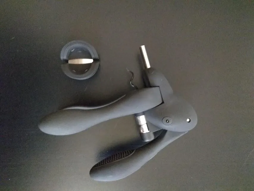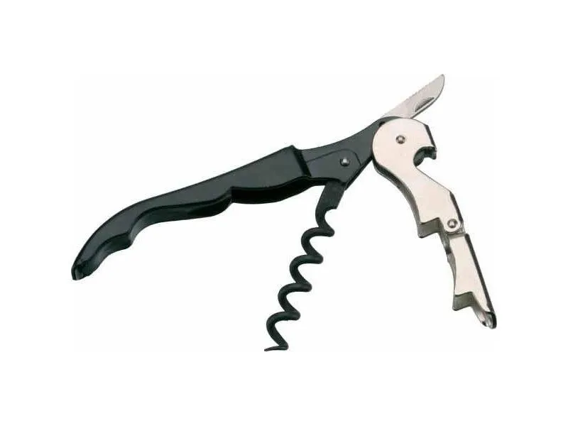 Візуально він нагадує складаний ніж і дуже простий у використанні. Маленьким лезом зрізається верх капсули на пляшці, вкручують гвинт у корок на 4 витка (до передостаннього), після цього в два прийоми витягуємо пробку, упираючи поріжки важеля у скло.