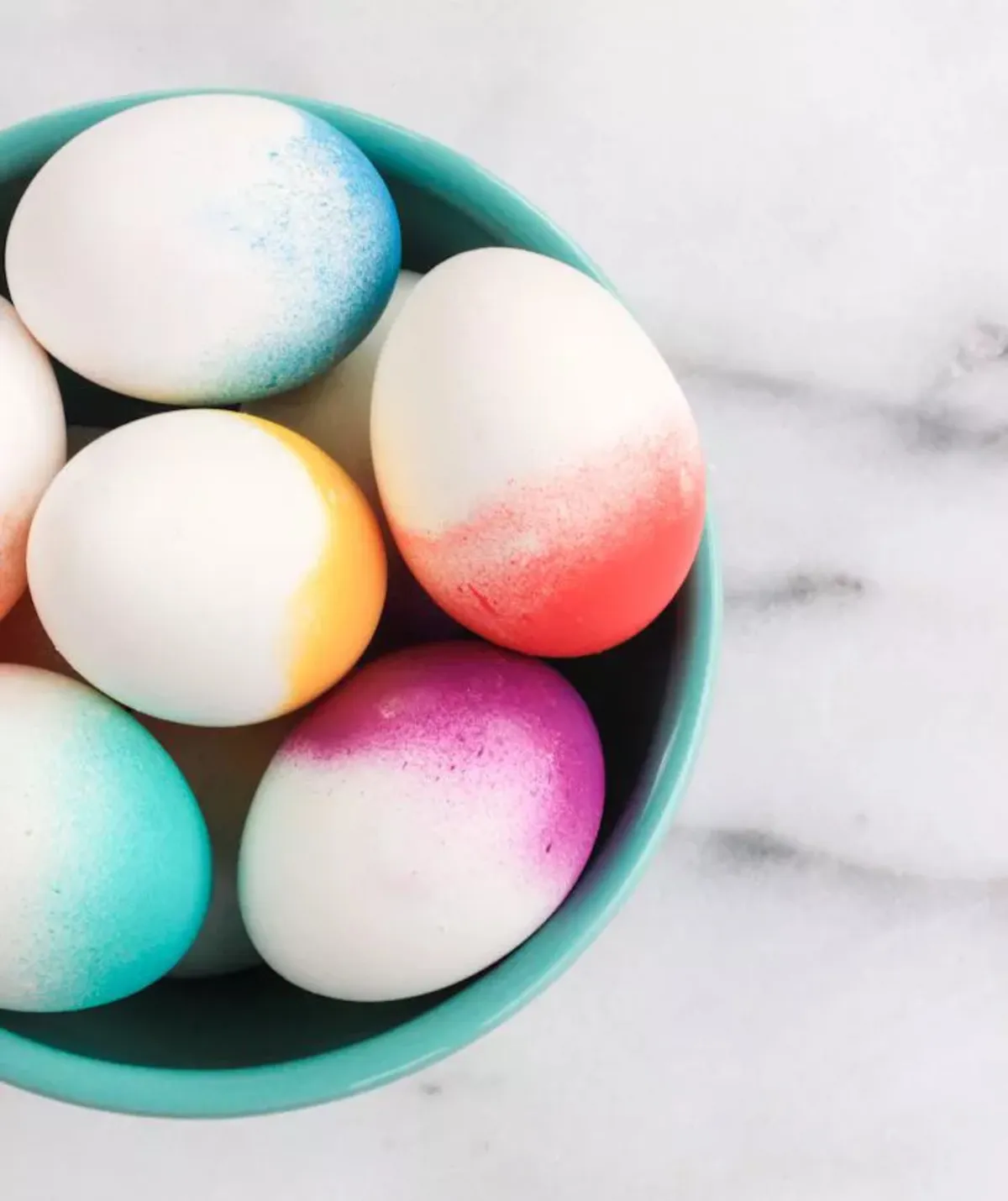 Пасхальні яйця з ефектом омбре можна зробити всього за кілька хвилин. Зваріть їх та покладіть у коробку більшим кінцем догори. Далі злегка покрийте яйця барвником з балончика чи пульверизатора, але будьте обережні, тому що якщо ви розбризкаєте занадто багато, надлишки фарби стечуть на яйце, псуючи вигляд. Дайте висохнути писанкам і ефект омбре готовий.