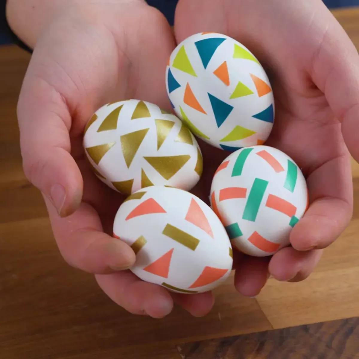 Виріжте зі скотчу невеликі форми, наприклад трикутники або лінії. Розташуйте їх на кожному яйці, щоб створити веселий і барвистий візерунок у вигляді конфетті й писанки готові.