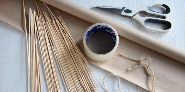 Багато дерев’яних паличок – від 2-3 штук на кожен фрукт. В ідеалі вони мають бути завдовжки від 25 до 30 сантиметрів. Короткі варіанти не підійдуть: букет вийде дуже мініатюрним – його буде складно зібрати.