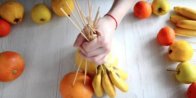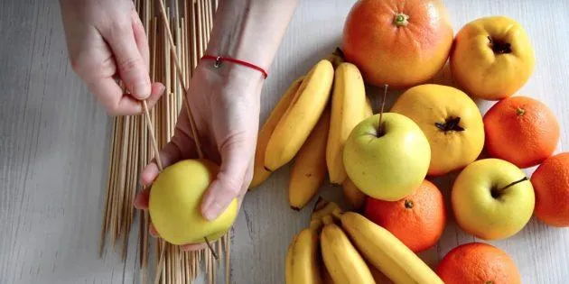 Насамперед уявіть, як виглядатиме композиція. Коли весь задум готовий – починаємо насаджувати фрукти на дерев’яні палички. Але пам’ятайте – не потрібно протикати їх повністю. Головне, щоб фрукти трималися на паличках.