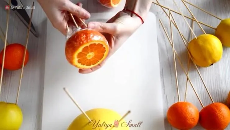 Якщо фрукт маленький, то достатньо лише однієї шпажки. Для більших необхідно 2-3 палички. Щоб перевірити, чи фрукт добре зафіксований, потрусіть його, взявши за шпажки.