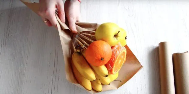 Повторіть так 2-3 рази. За бажання нижню частину можна закріпити скотчем або перев’язати шнурочком, щоб букет не розвалювався. І все – ця фруктова краса вже готова.