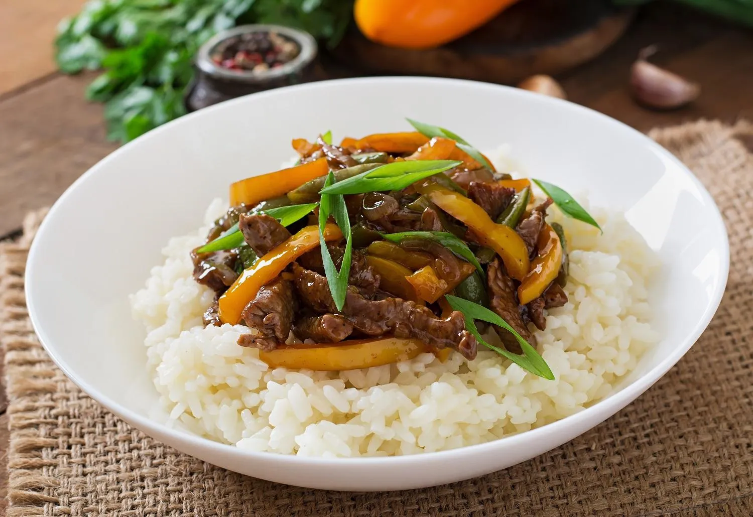 Яловичина, смажена з овочами, та рисом на гарнір / Фото freepik