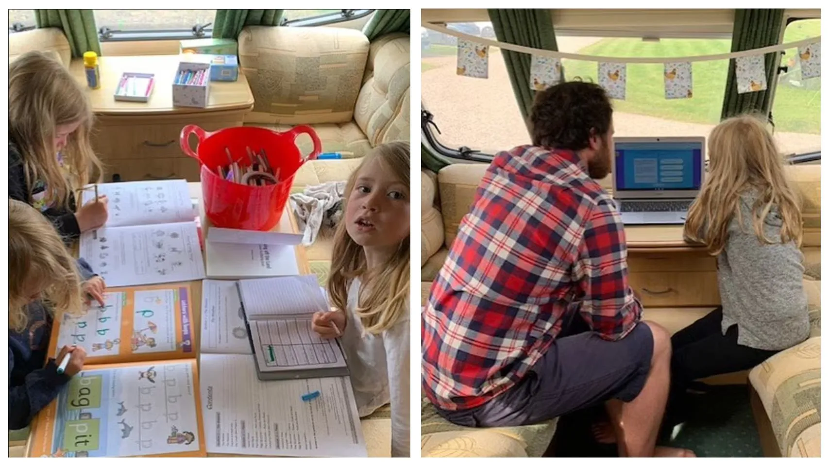 Комфортно розміститись такою великою родиною в одному фургоні – завдання не з легких, та Каррі та Бену Лепп'єр це вдалось. У приміщенні є всі необхідні меблі, невеличка кухонна зона, компактний душ та туалет. А для дівчаток є навіть окремий столик для навчання.