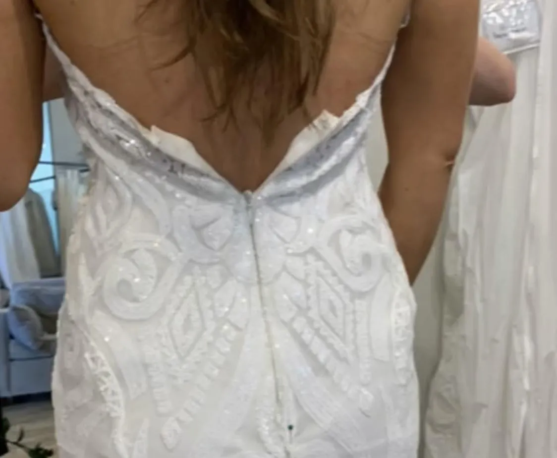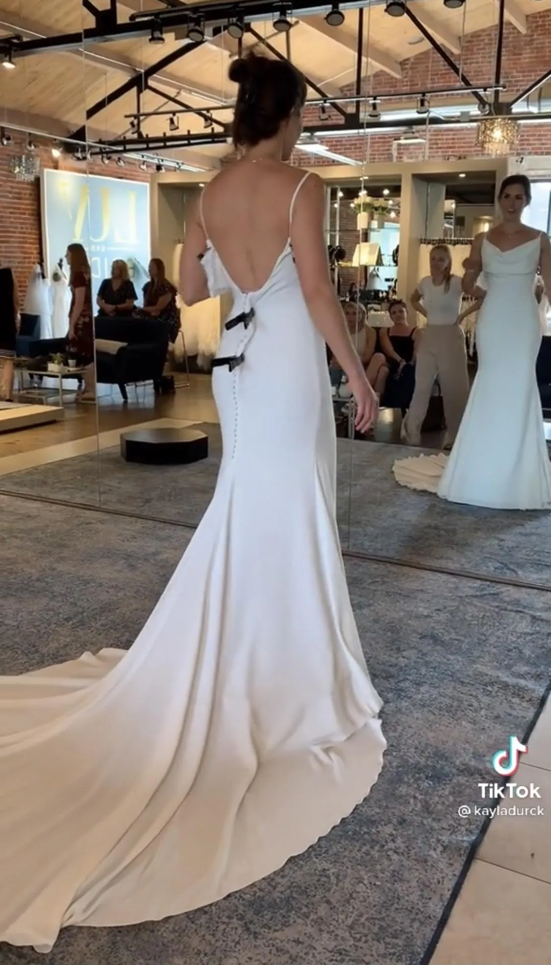 До того ж ззаду сукня виглядала жахливо: тканина була крива та розтягнута. Вона навіть не змогла застібнути замок і це стало найбільшим розчаруванням. У такому вбранні наречена не могла піти на весілля, тому відправилась на пошуки нового.